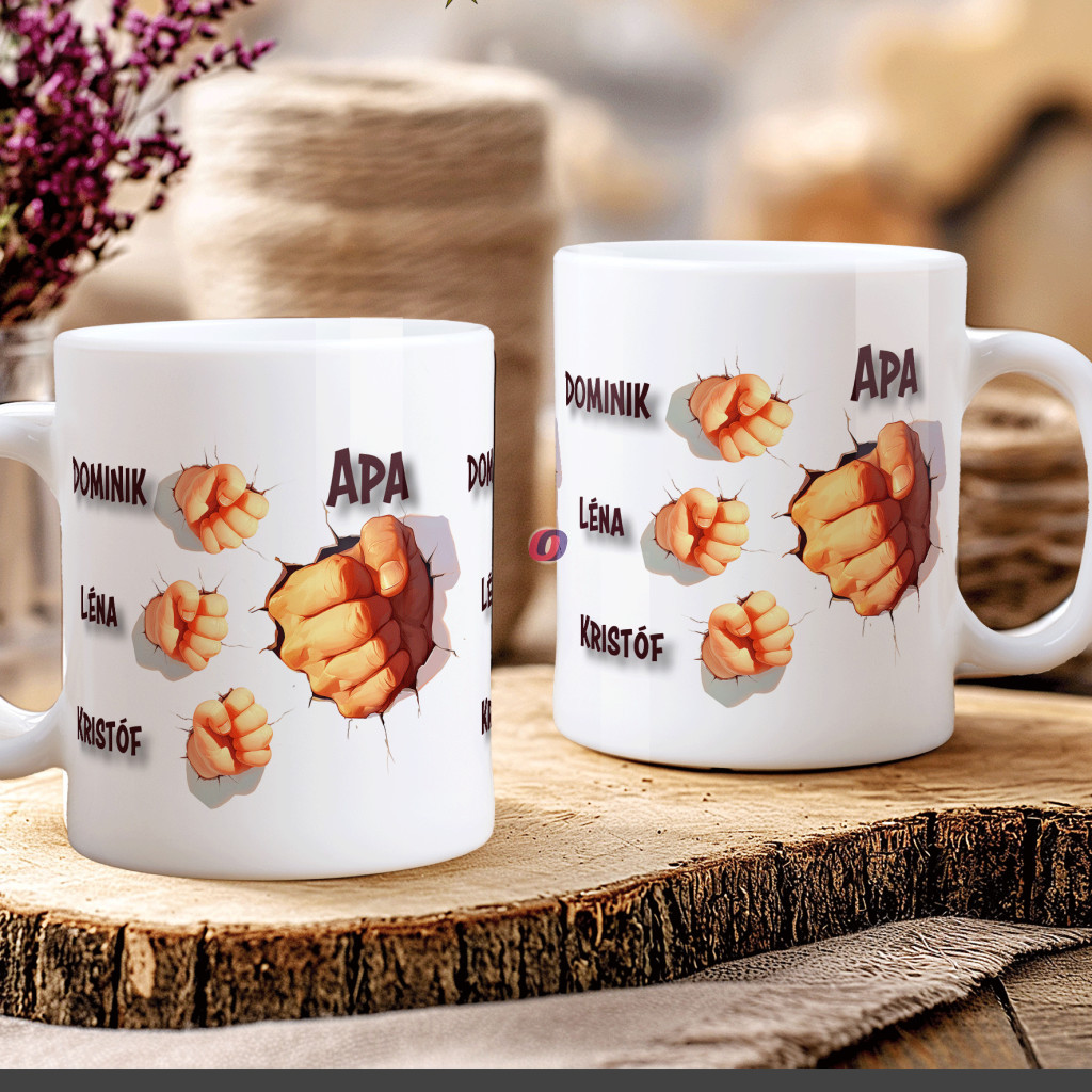 - Egyedi feliratos Apák napi bögre "3D kezek, Max 5 gyerek"