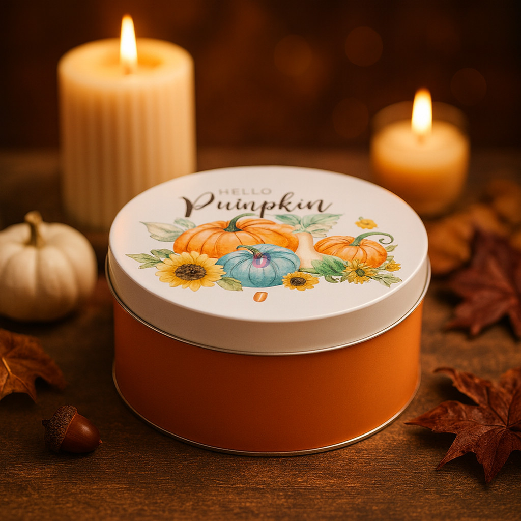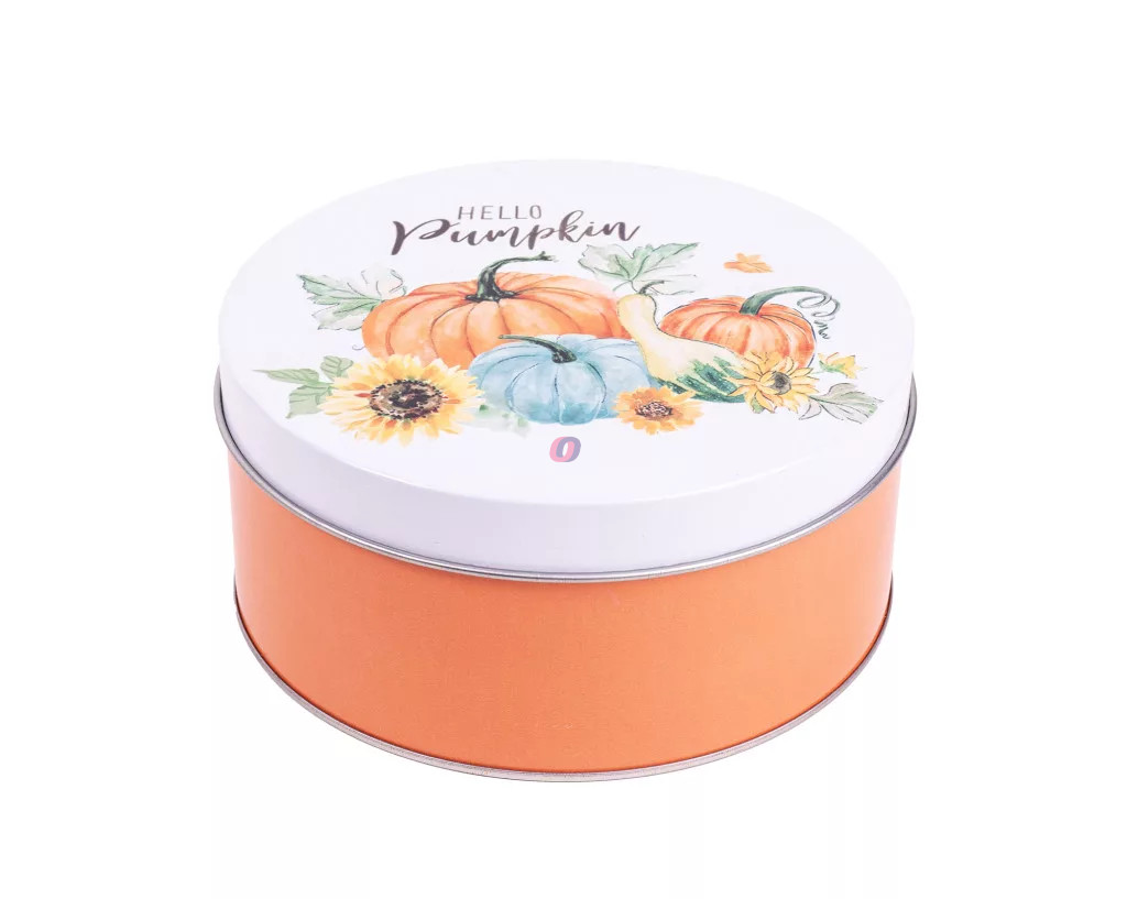 2 darabos bádog doboz szett – Őszi tök mintával, krém-narancssárga (Ø16 és Ø14 cm)