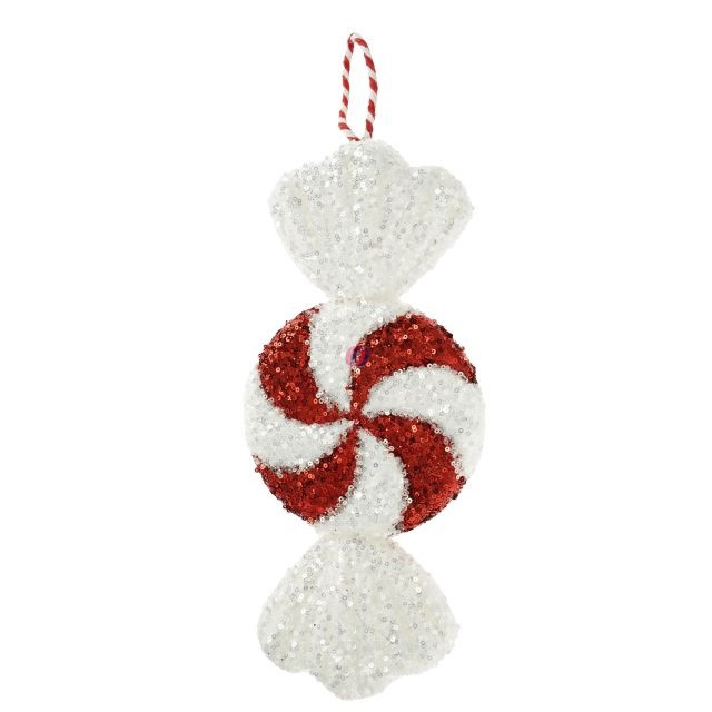 | Megnevezés | Cukorka forgó mintás, óriás, akasztós flitteres polyfoam 32x12x6 cm fehér, piros |