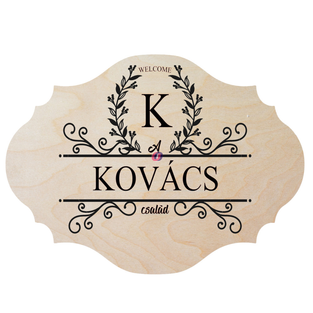 Stílusos, egyedi családi névvel ellátott üdvözlő tábla, mely kiváló ajtódísz is lehet. Ideális a bejárati ajtóra akasztva, vagy a bárhol a lakásban. Anyaga natúr fa.