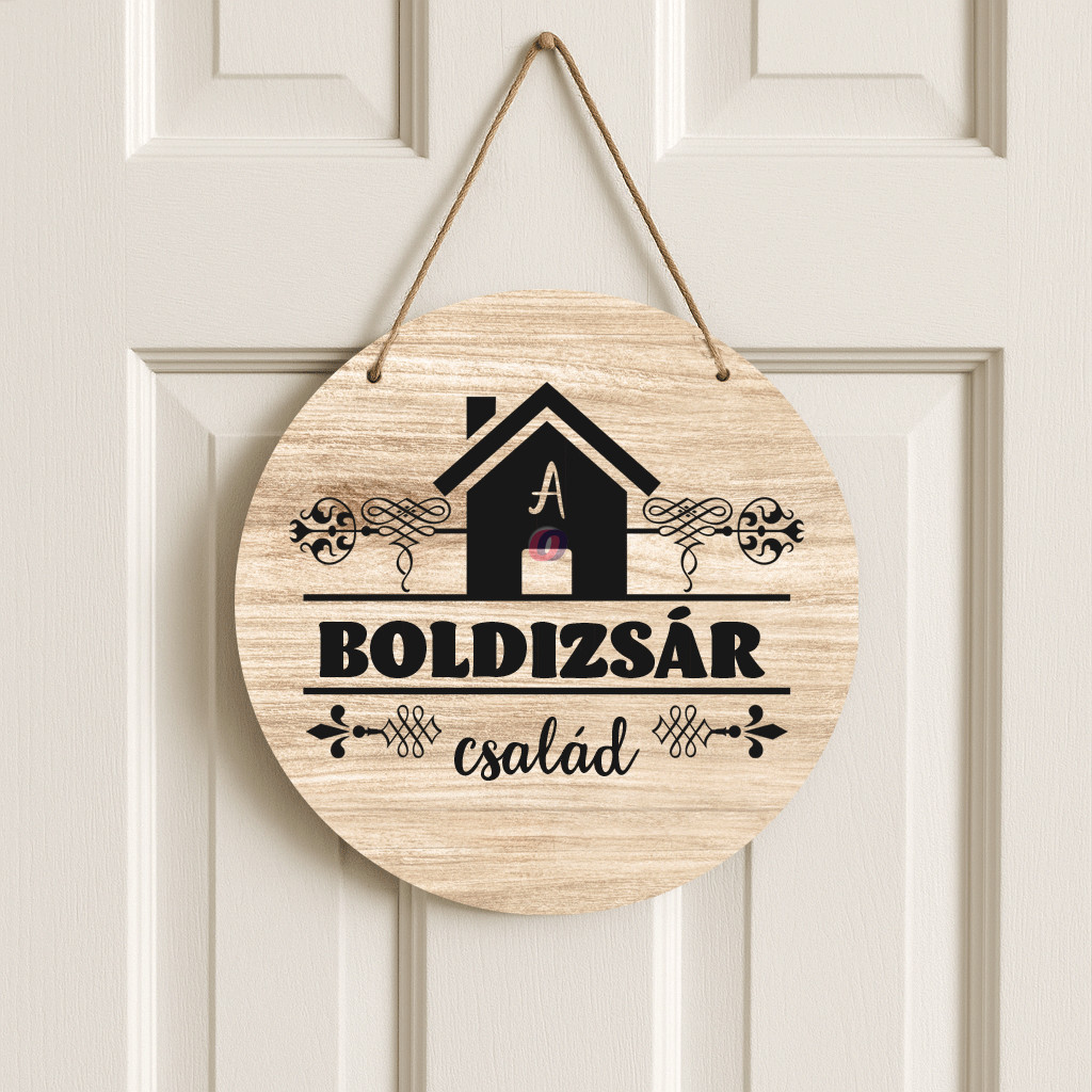 Stílusos, egyedi családi névvel ellátott üdvözlő tábla, mely kiváló ajtódísz is lehet. Ideális a bejárati ajtóra akasztva, vagy a bárhol a lakásban. Anyaga natúr fa.