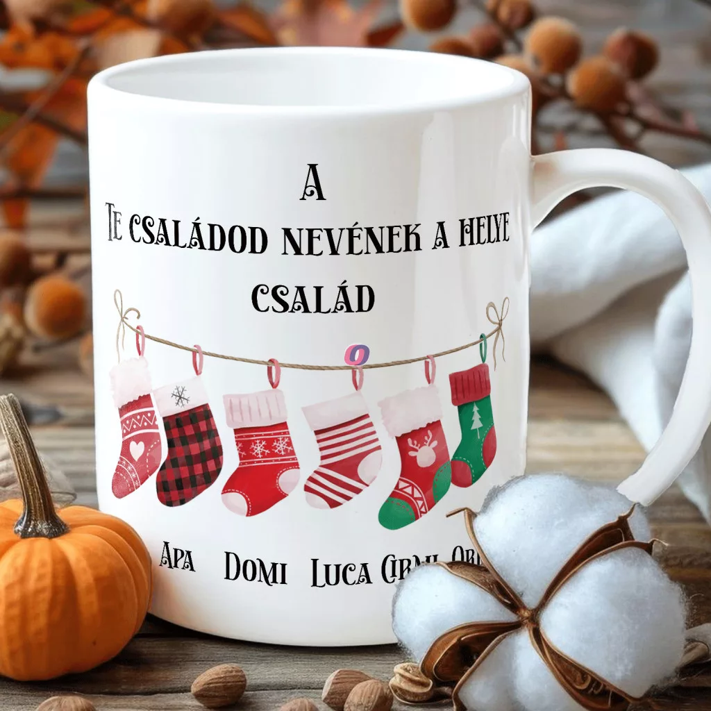 - Egyedi neves karácsonyi bögre "Harisnyás család" 330 ml kerámia Full HD