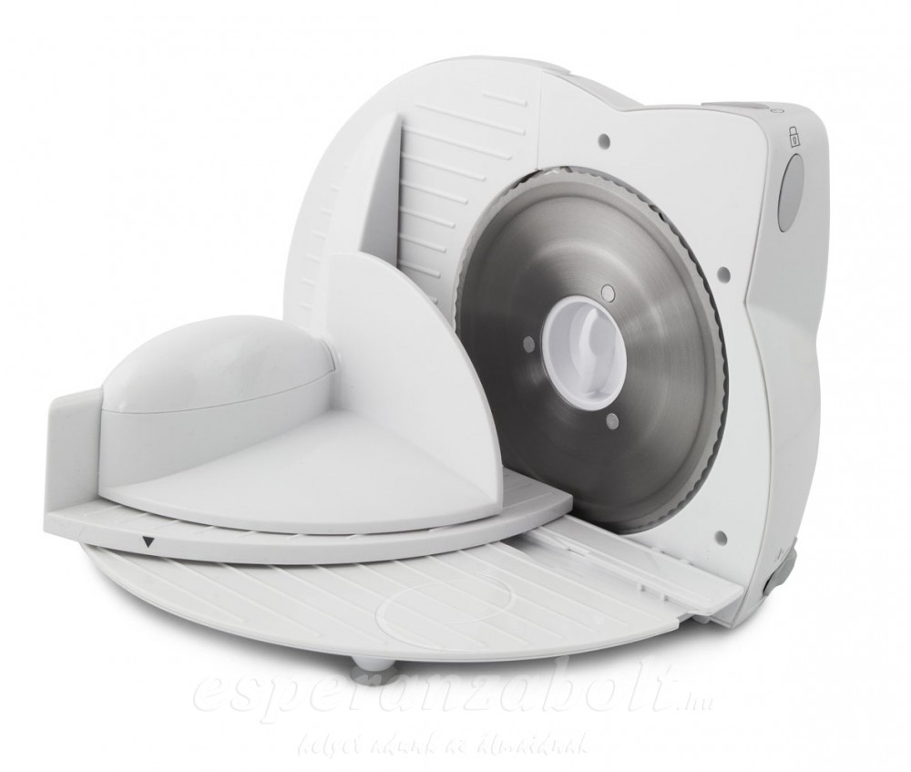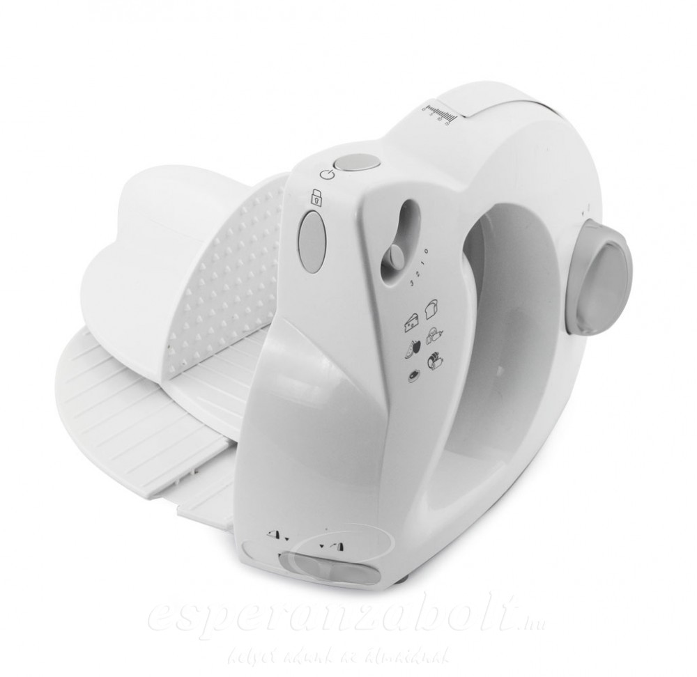 A szelet vastagság széles választékának köszönhetően az Esperanza élelmiszer-szeletelő segítségével kenyeret, húst, sajtot, szalámit, gyümölcsöt és zöldségeket szeletelhet egyenlő és azonos vastagságú szeletekre. A véletlen indítással szemben védett biztonsági zárnak köszönhetően a szeletelőgép használata nagyon biztonságos. Ergonomikus kialakítása minden konyhába illeszkedik. A csúszásgátló tapadókorongok stabil és kényelmes munkát biztosítanak.