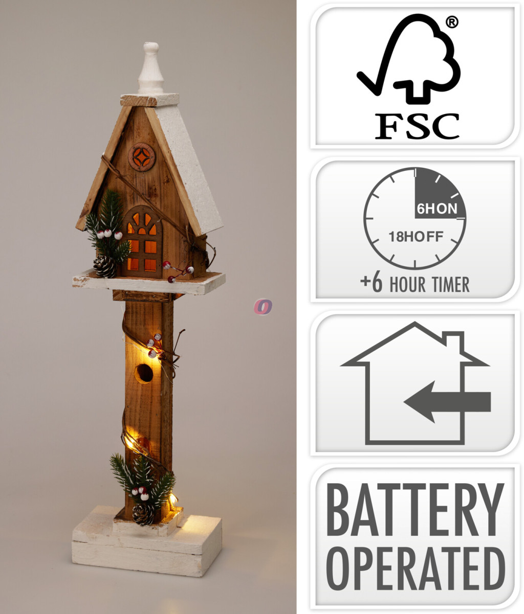 Teremts meghitt ünnepi hangulatot ezzel a fából készült, világító házikóval! A barna színű, fehér tetős kis ház természetes ágakkal, tobozokkal és piros bogyókkal van díszítve, így igazi téli hangulatot áraszt. A beépített 10 darab melegfehér LED fény barátságos fényt biztosít, amely tökéletesen illik a karácsonyi enteriőrbe.