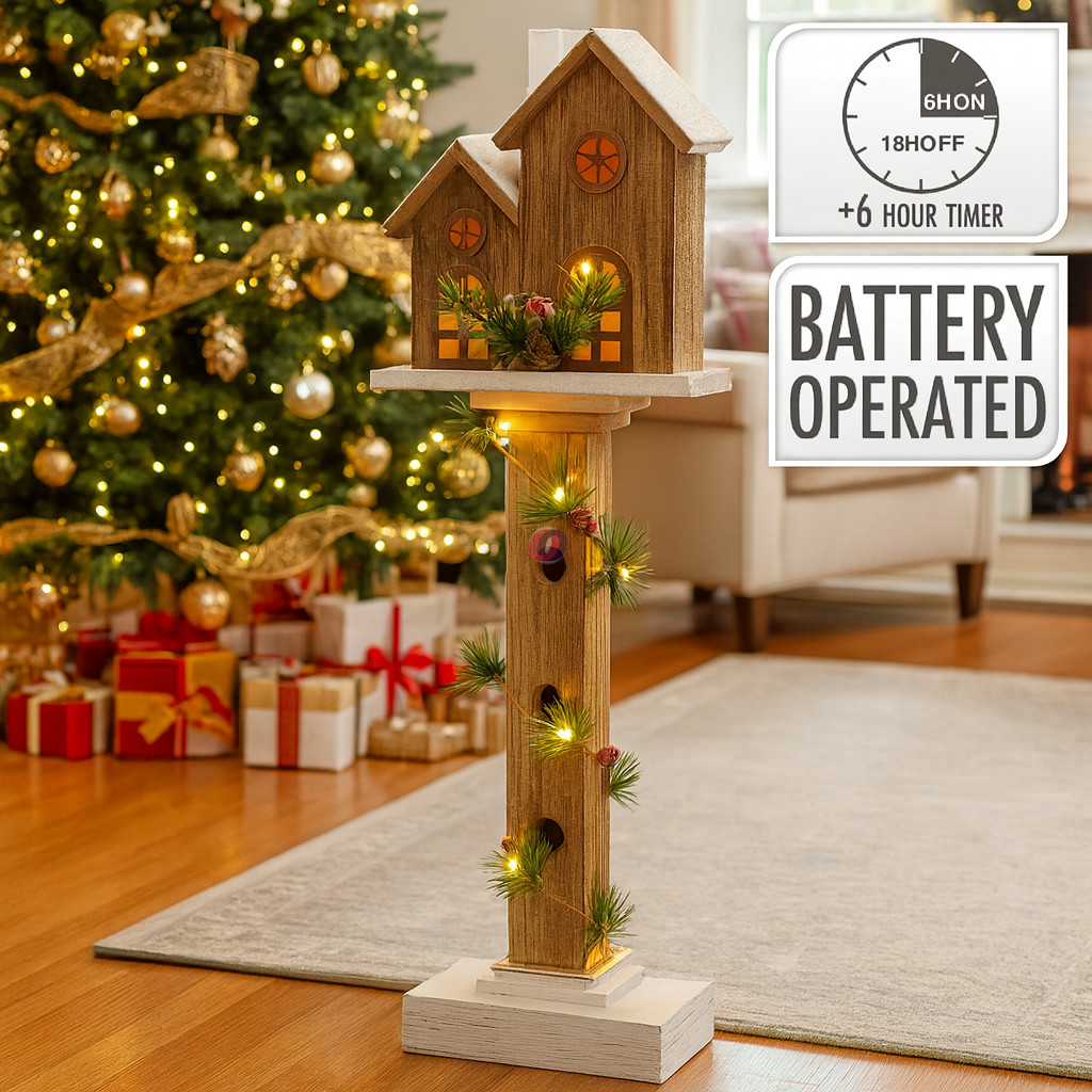 Ez a stílusos, természetes fa hatású dekor faház hangulatos, meleg fénnyel világítja meg otthonát az ünnepi időszakban. A barna alapszín, a fehér tető és a gondosan elhelyezett ág- és bogyódíszítés tökéletesen illeszkedik a skandináv és természetes karácsonyi enteriőrökbe.