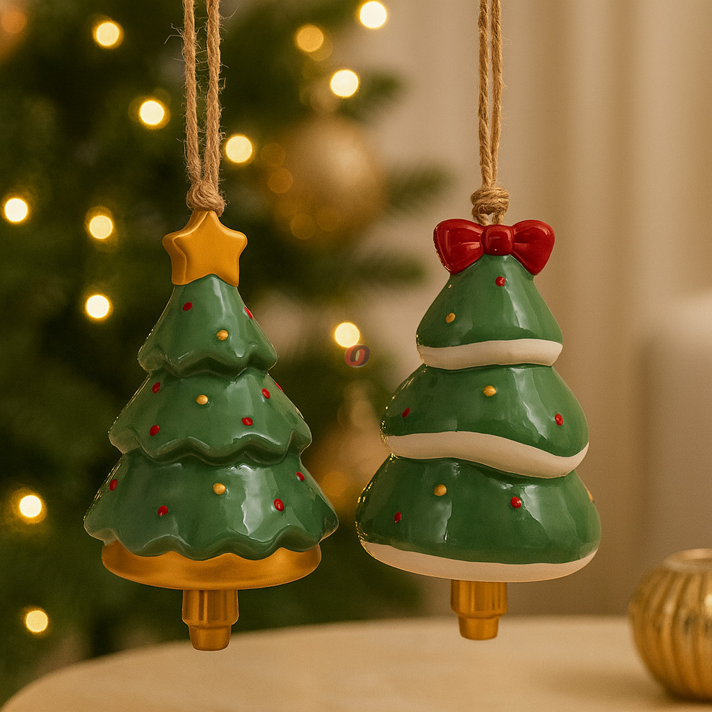Fenyőfa alakú karácsonyfadísz 11 cm kerámia csengettyű, választható kivitelben