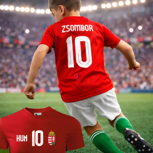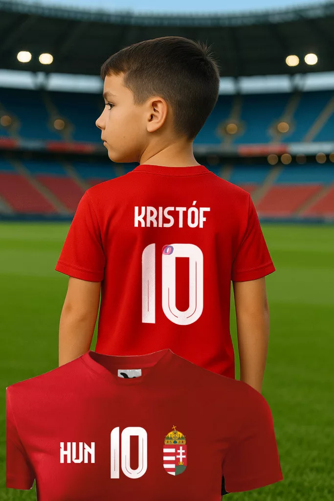 Ez a különleges sportmez teljes mértékben személyre szabható: a hátoldalára egyedi név és mezszám kerül, így gyermeked úgy érezheti magát, mint kedvenc sportolója a pályán. Tökéletes választás születésnapra, csapatversenyekhez vagy akár családi focimeccsekhez is. Az alapár tartalmazza az egyedi nyomatot a póló hátán (név + szám), felár ellenében pedig opcionálisan mellkasi minta (magyar címer, szám és HUN felirat) is kérhető.
