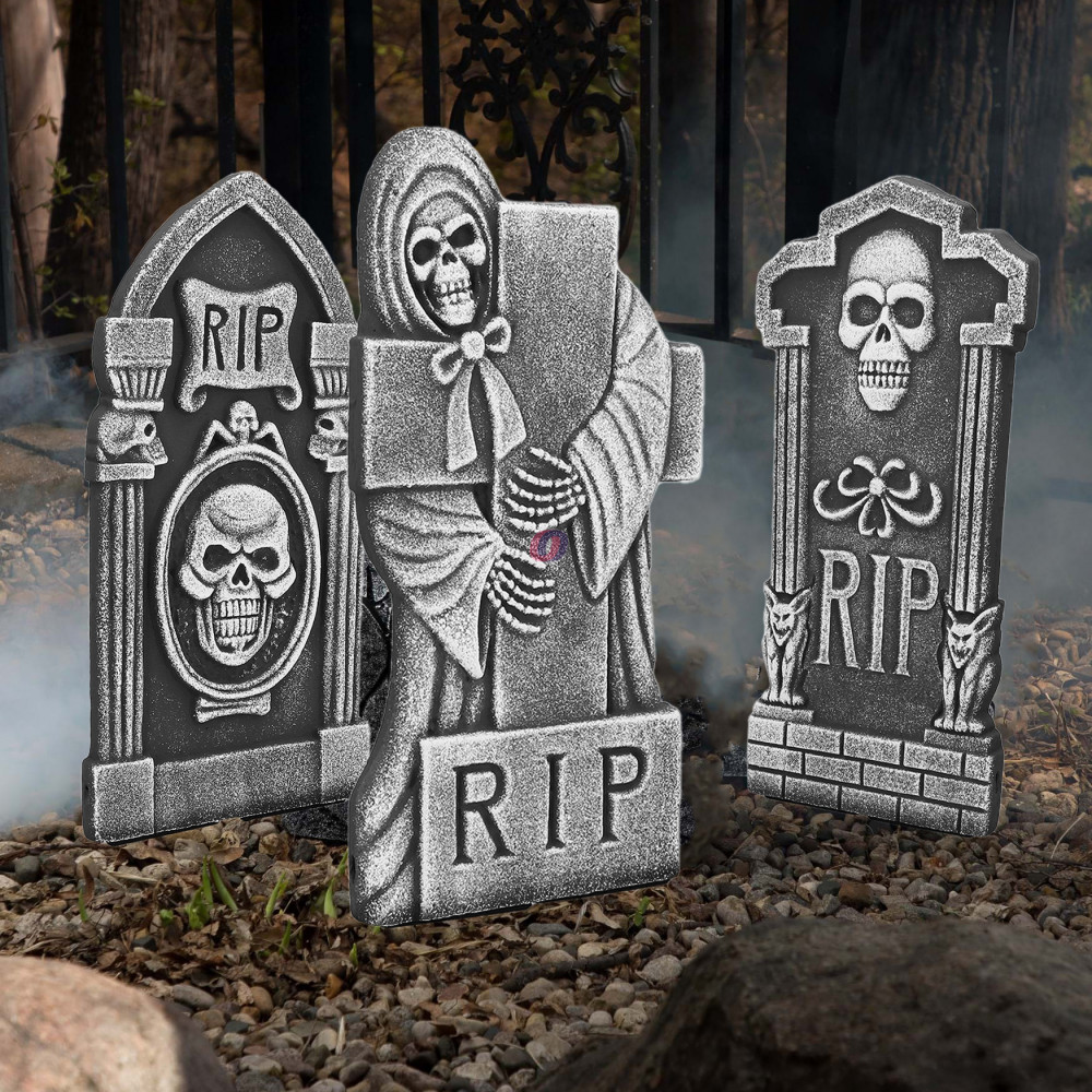 A Halloweeni sírkő dekoráció RIP felirattal is rendelkezik, amely hozzáadja az extra rémisztő hatást a díszítéshez.