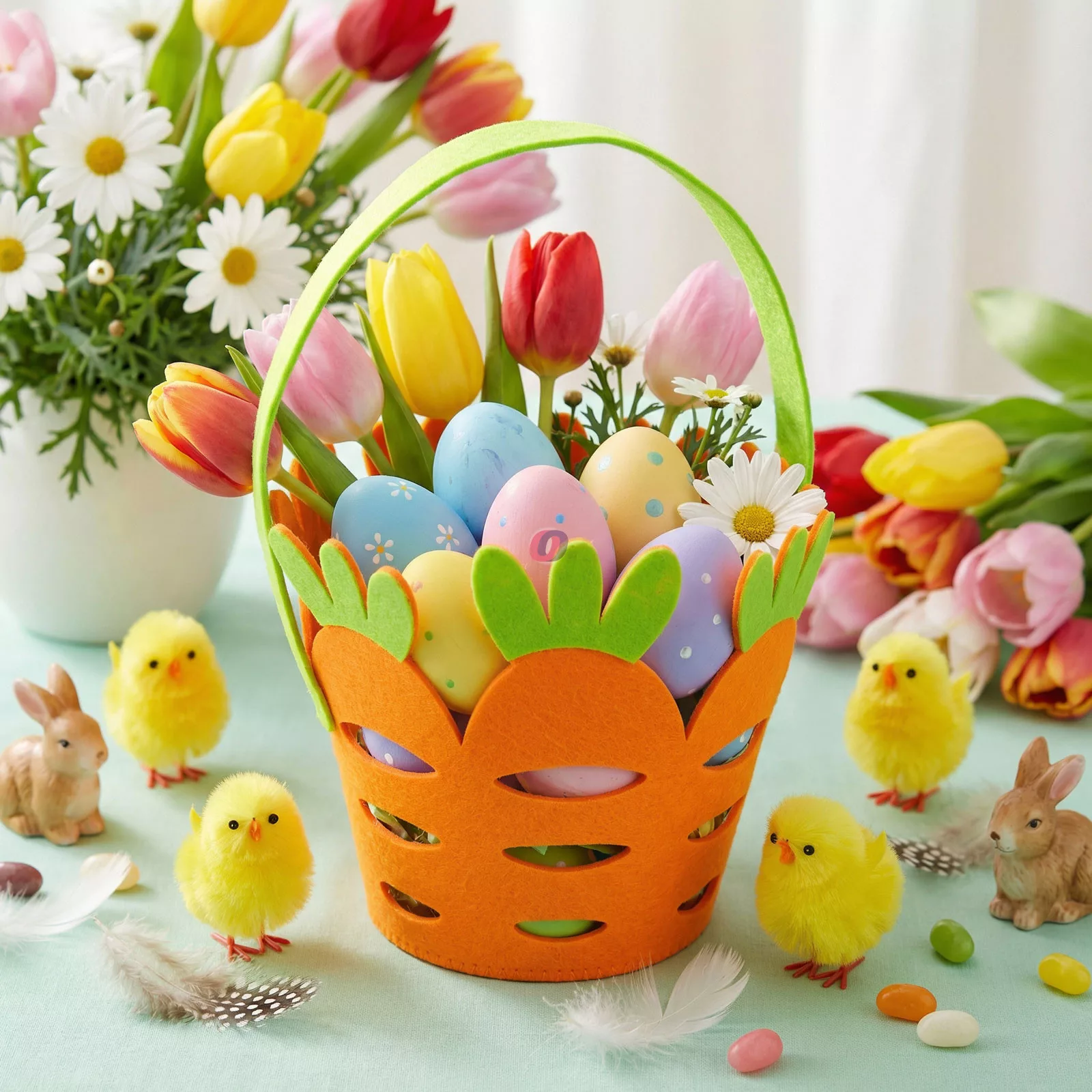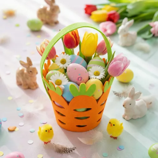 Tegye még vidámabbá a húsvéti ünnepeket ezzel a különleges, répa formájú filc kosárral! A kosár élénk narancssárga és zöld színben készül, praktikus fogantyúval ellátva. Ideális választás húsvéti tojások, édességek, apró ajándékok gyűjtésére vagy ünnepi dekorációhoz. Könnyű, mégis tartós filc anyagból készült, amely vidám, tavaszi hangulatot teremt bármely otthonban.