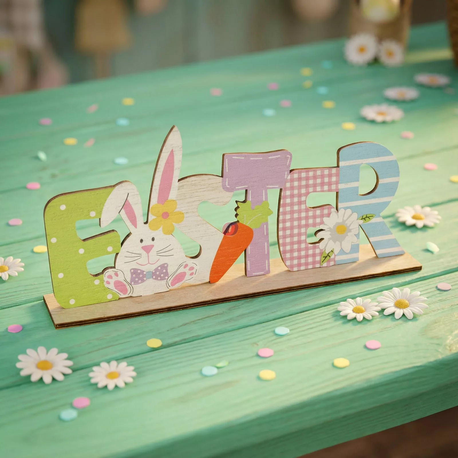 Dobja fel ünnepi asztalát ezzel a vidám, nyuszis húsvéti dekorációval! A fából készült fekvő asztaldísz színes betűkkel formázza az "EASTER" feliratot, amelyet aranyos nyuszi, répa és tavaszi virágok díszítenek. A dekoráció könnyedén elhelyezhető asztalon, polcon vagy komódon, és azonnal ünnepi hangulatot teremt otthonában. Tartós fa anyagának köszönhetően hosszú ideig megőrzi szépségét, így évről évre újra felhasználható.