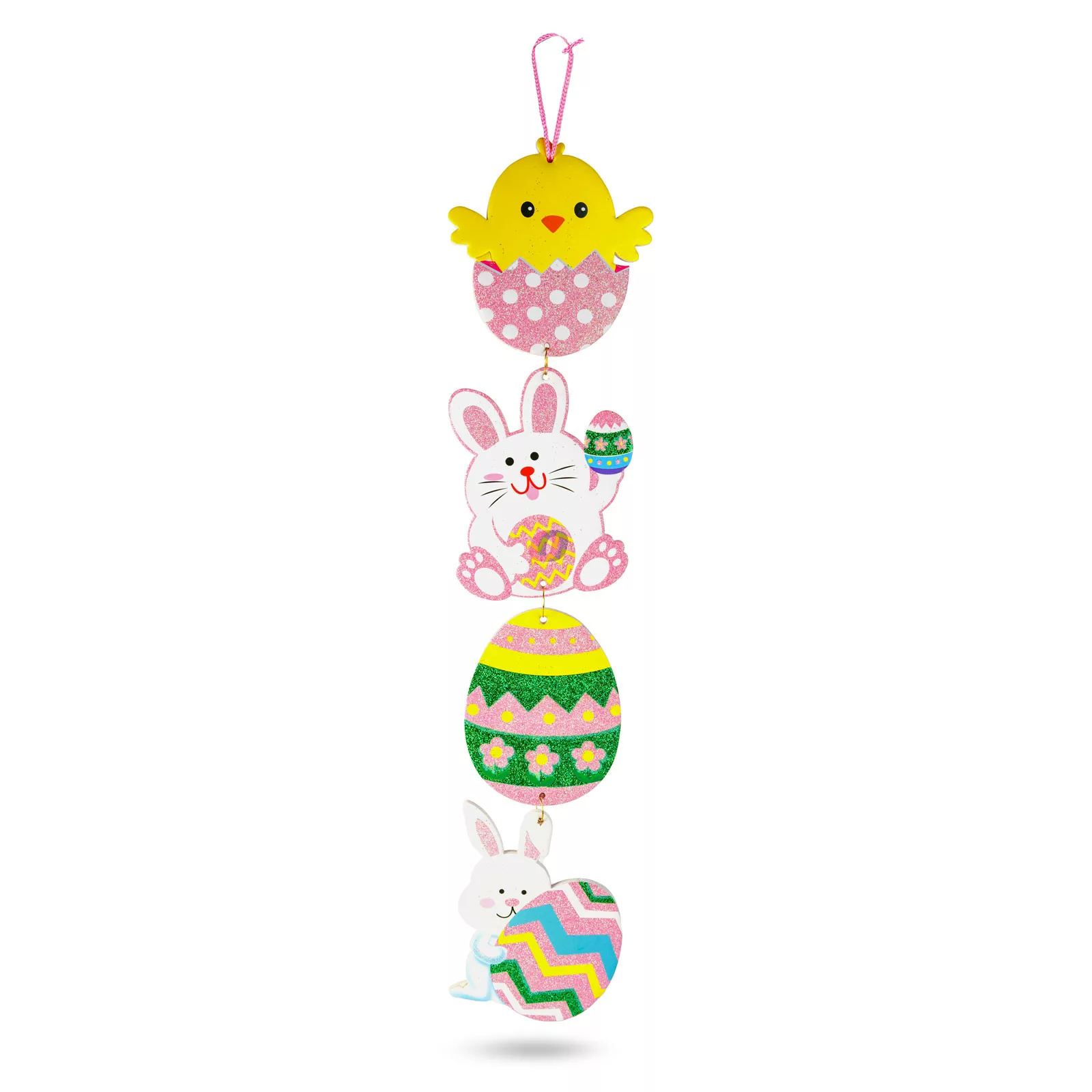 Dobja fel otthonát ezzel a látványos húsvéti függő dekorációval! A csillámos hablemezből készült dísz négy részből áll, amelyek között aranyos nyuszi, csibe és színes húsvéti tojás motívumok találhatók. Vidám színei és csillogó felülete garantáltan ünnepi hangulatot teremt a lakásban. Könnyedén felakasztható ajtóra, ablakra, falra vagy akár gyerekszobába is, és remekül illik bármely húsvéti dekorációs kompozícióhoz.