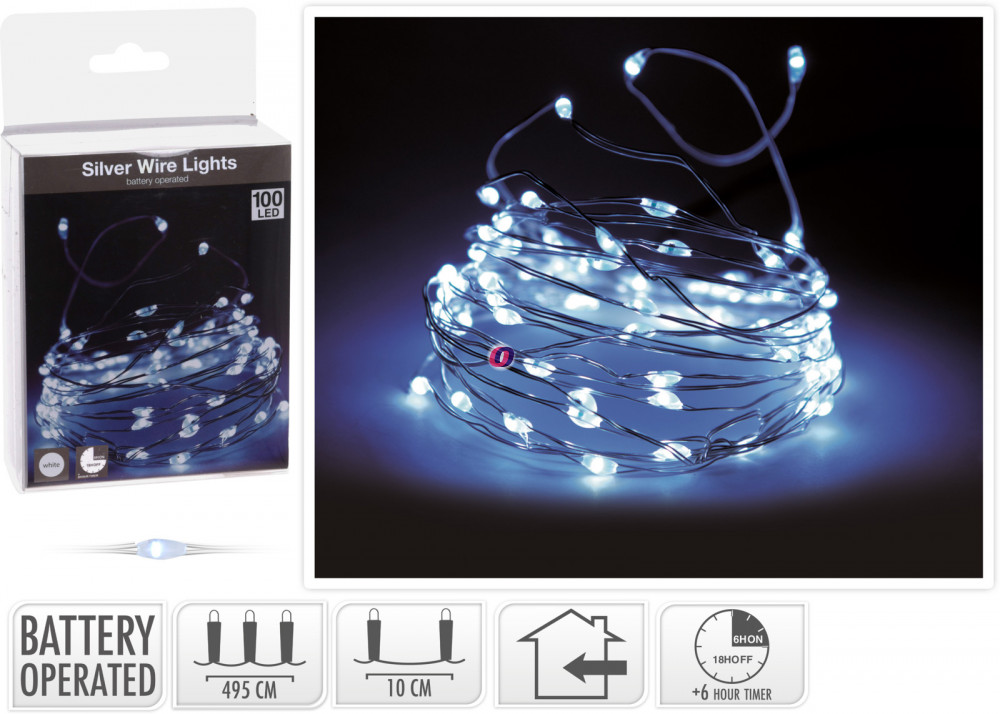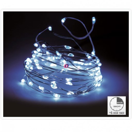 Időzítős Micro LED fényfűzér 100 LED hidegfehér ezüstdrót elemes
