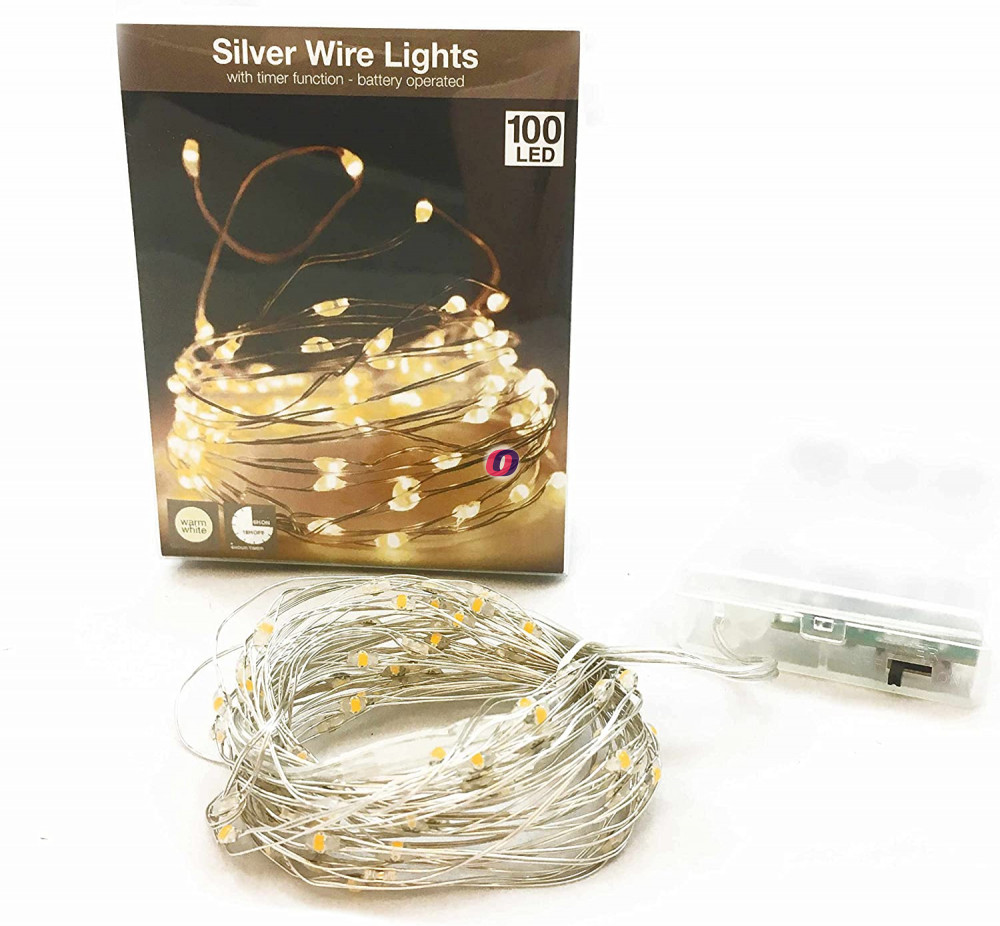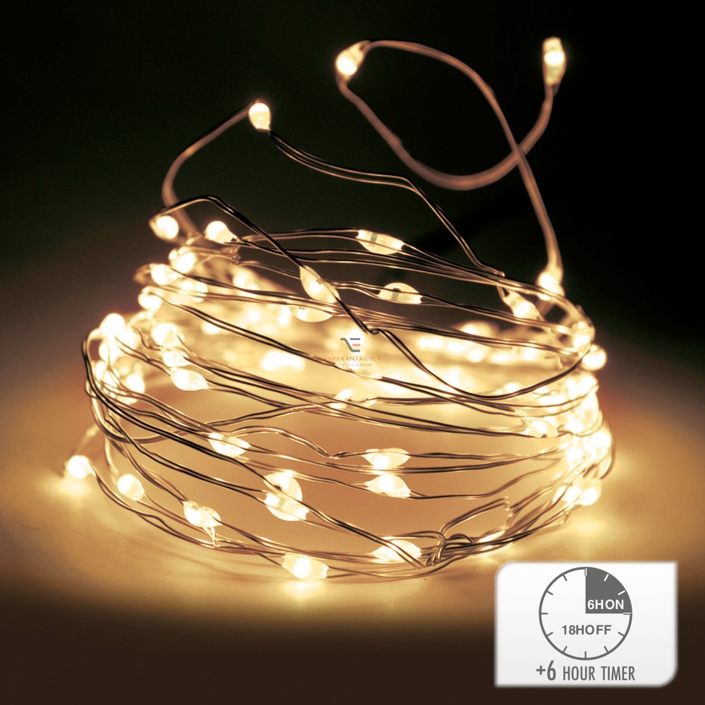 Időzítős Micro LED fényfűzér 100 LED melegfehér ezüstdrót elemes 505cm
