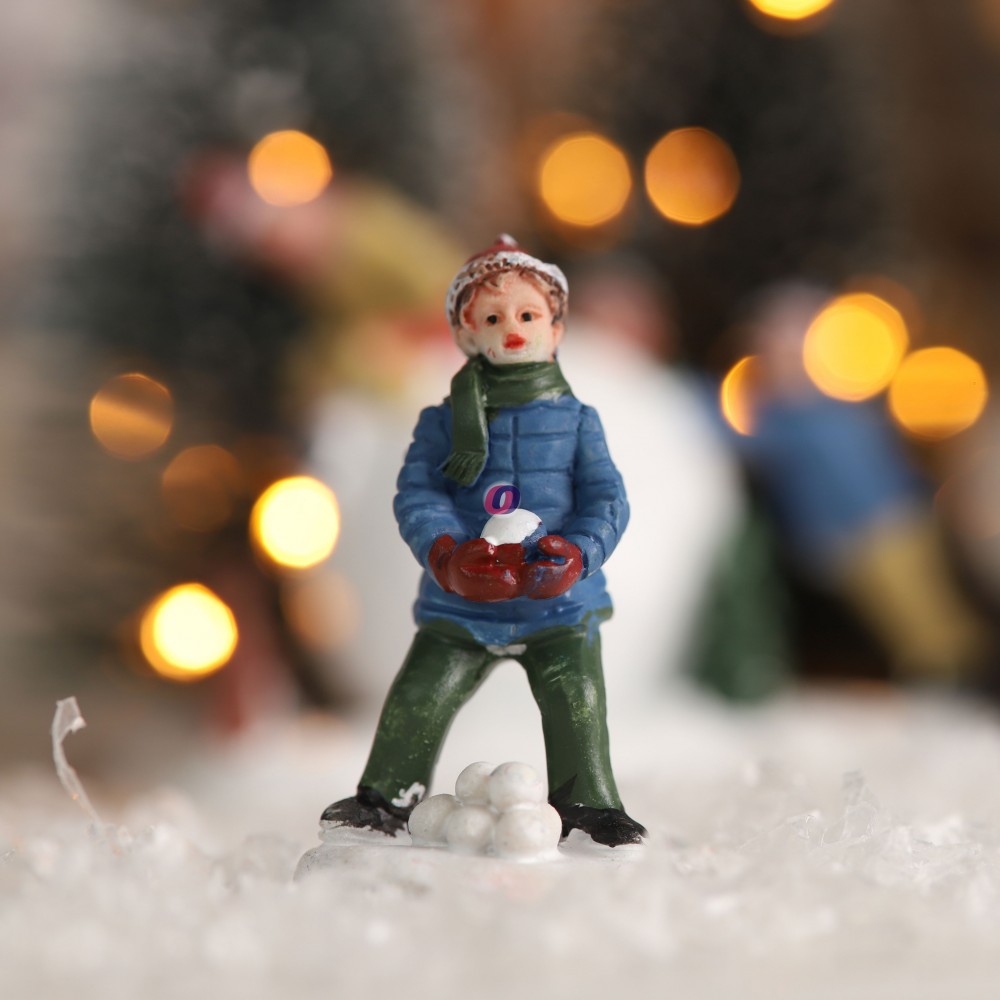 Karácsonyi falu makett figura fiú hógolyókkal kék kabátban