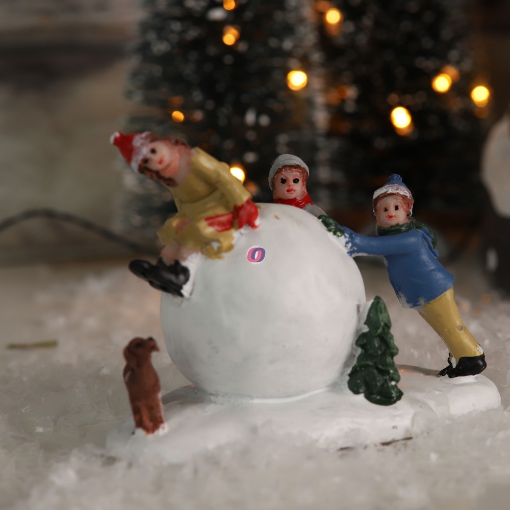 Karácsonyi falu makett figura hólabdát gurító gyerekek