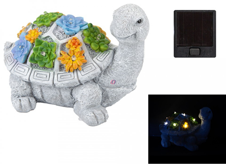 Kerti figura szolár teknősbéka lámpa, kőhatású, színes pozsgás növényekkel 25 cm