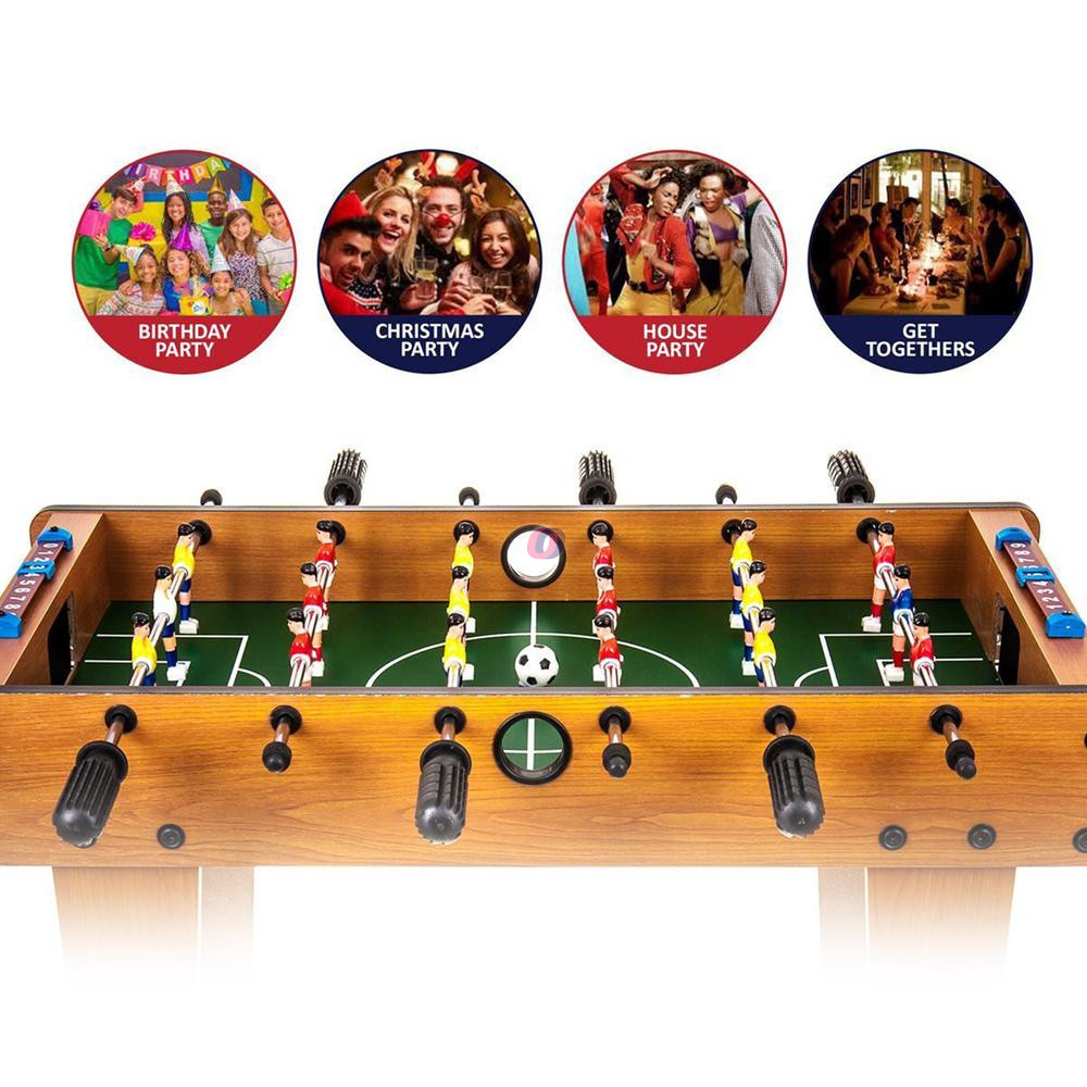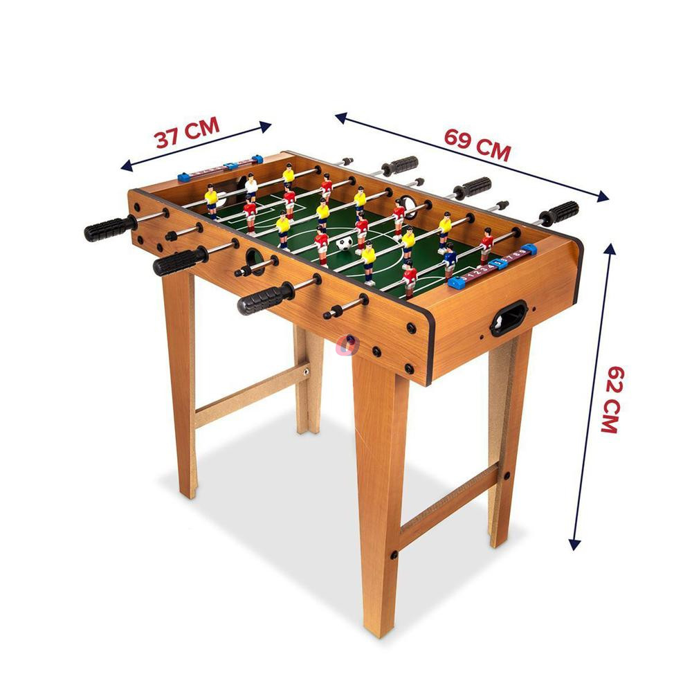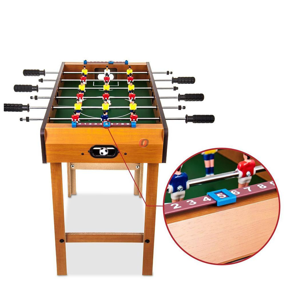 Focizzon gyerekeivel anélkül, hogy elhagyná otthonát! A csocsózás már évek óta ismert és kedvelt, ennek ellenére még mindig remek időtöltés. Minden futballrajongónak rendelkeznie kell egy ilyen asztallal - a kor nem számít, csak a szórakozás vágya! Használata rendkívül egyszerű, maga a termék pedig nem foglal sok helyet. A csocsóasztal 2 fő számára készült. A praktikus fogók jól illeszkednek a kézbe, így a játékosok könnyen tudják irányítani a játék menetét. Közvetlenül a kapusok mögött lyukak vannak a labdák számára, ahová a szerzett gólok kerülnek. A játéktér szerkezetében két gólszámláló került elhelyezésre, amelyeket manuálisan állítanak be - mindkét oldalon van egy skála 0-tól 9-ig, ami megkönnyíti az eredmények ellenőrzését az összecsapás során. Termékünk könnyen tisztán tartható, kis helyen is elfér.