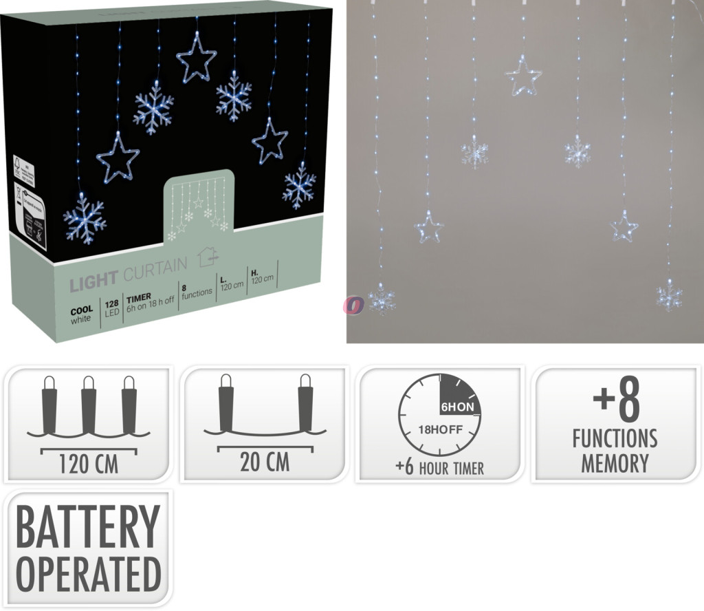 Varázslatos karácsonyi fényfüggöny, amely meleg ragyogást visz otthonodba! Ez a 128 LED-es mikrofényfüggöny hópehely és csillag motívummal díszített, így tökéletes választás ablakba, falra vagy háttérdekorációnak. Modern, elemes kialakításának köszönhetően bárhol könnyen elhelyezhető.