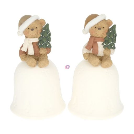 | Megnevezés | Maci fenyővel, harangon ülő, LED-es poly 11x11x19 cm fehér, mályva 2 féle |