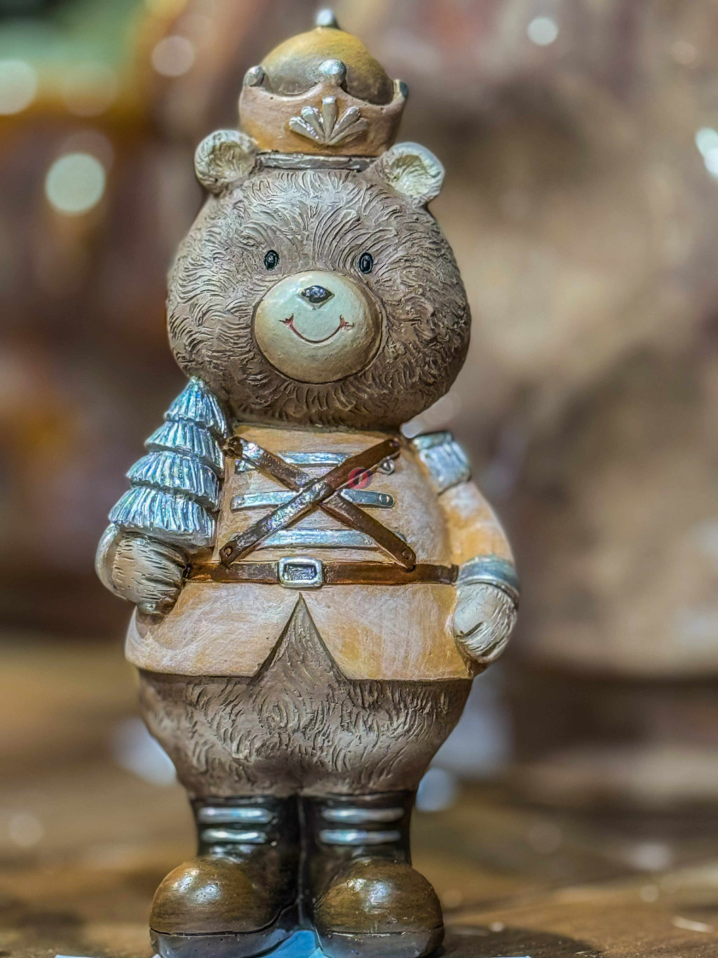 A „Medve ruhában fenyővel, ajándékkal álló poly 6,5x5x13,5 cm barna 2 féle” dekoráció klasszikus karácsonyi hangulatot teremt. Részletgazdag megjelenése azonnal a figyelem középpontjába kerül.