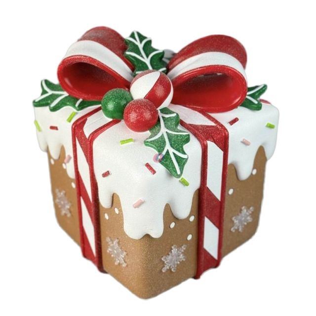 A „Mézeskalács ajándékdoboz, glitteres LED-es poly 21x21x26 cm barna, fehér” dekoráció klasszikus karácsonyi hangulatot teremt. Részletgazdag megjelenése azonnal a figyelem középpontjába kerül.