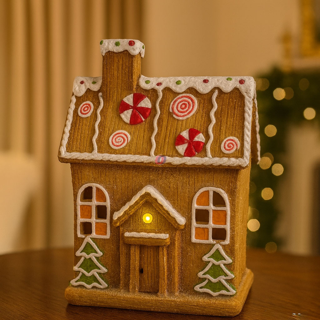 A „Mézeskalács ház LED-es poly 16,5x11x23 cm barna, fehér” dekoráció klasszikus karácsonyi hangulatot teremt. Részletgazdag megjelenése azonnal a figyelem középpontjába kerül.