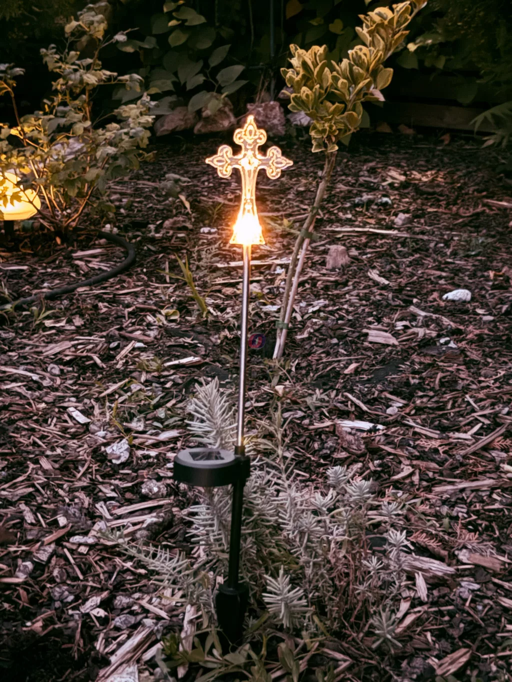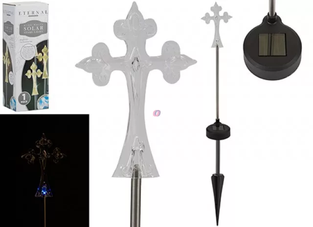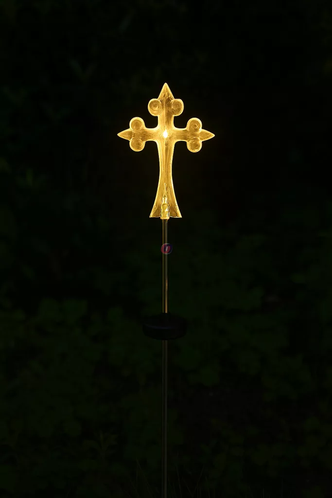 A finoman kidolgozott kereszt időjárásálló, tartós anyagból készült, és beépített LED világítással rendelkezik, amely napelemmel működik – nincs szükség hálózati áramforrásra. Tökéletes választás sírok, emlékhelyek vagy kertek díszítéséhez, nappal és éjszaka egyaránt.