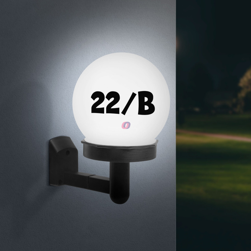 Egyedi házszám napelemes göm alakú falikaron, ami minden bejáratot különlegessé varázsol. Add meg a házszámot és mi elkészítjük számodra, neked csak fel kell helyezned a tartozék szerelvények segítségével a ház homolokzatára vagy a kerítésre!
