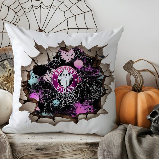 Őszi Párnahuzat "Spooky vibes violet" 40x40 cm. Kiváló minőségű Halloweeni dekorációs kiegészítő, de szuper ajándék is lehet