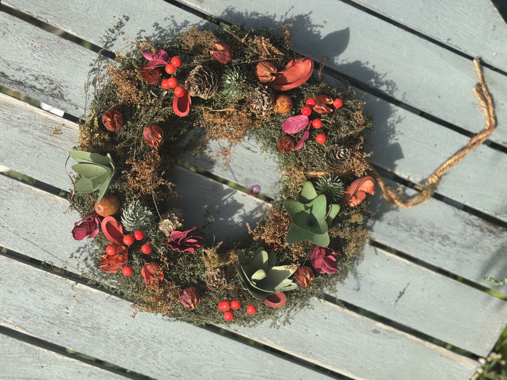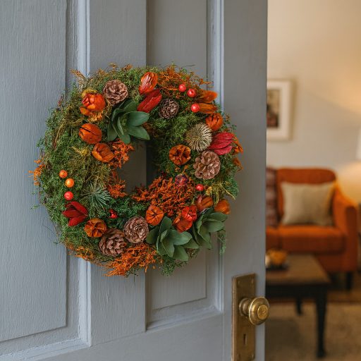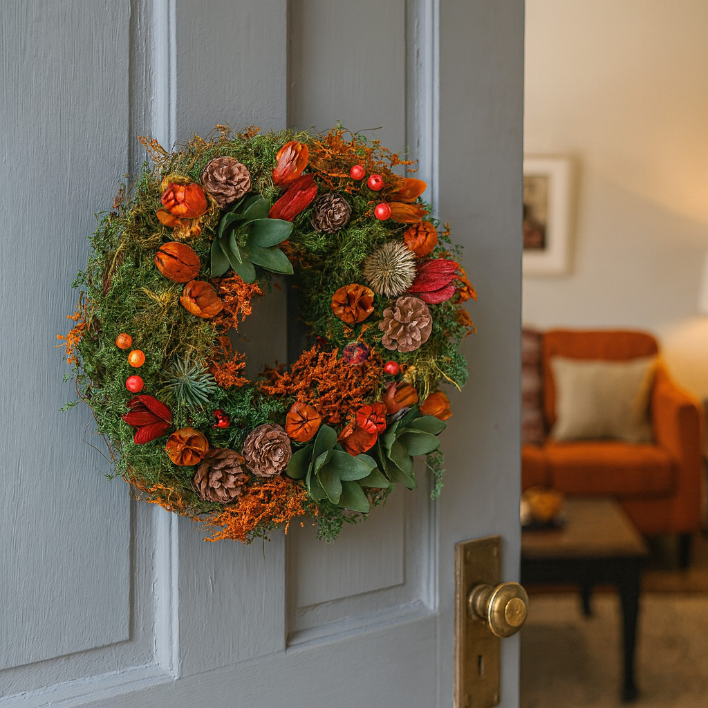 Prémium kivitelű luxus ajtódísz, melyet a varázslatos erdőben megtalálható moha, fűfélék toboz termések, és az ősz jellegzetes gyümölcsei ihlettek.