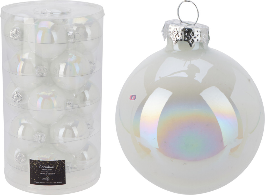 Díszítsd karácsonyfádat ezzel a 20 darabos üveggömb szettel, amely elegáns fehér, irizáló gyöngyház fényével varázsolja ünnepivé otthonodat. A klasszikus forma és a különleges felület fényjátéka minden karácsonyfán gyönyörűen mutat.