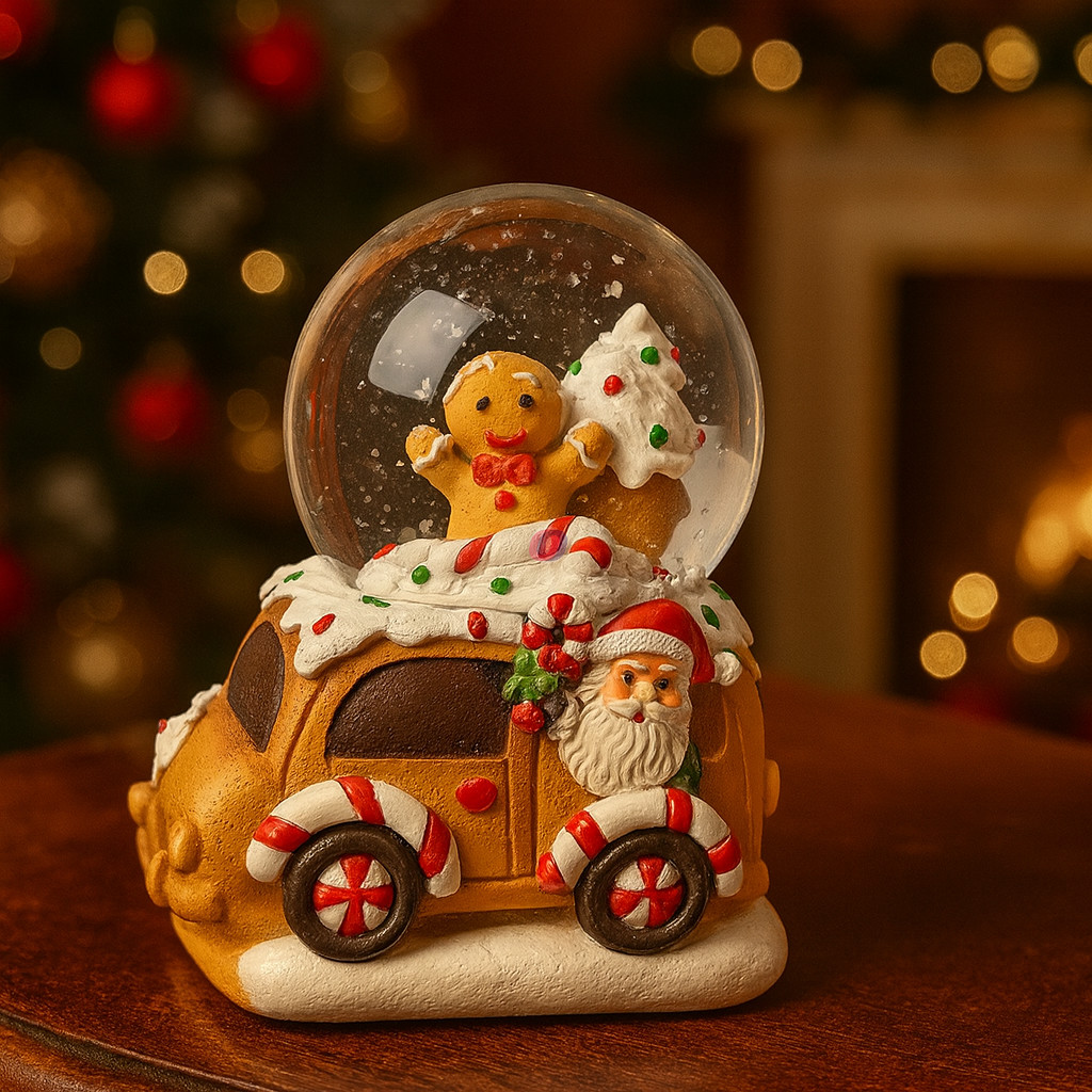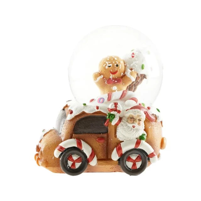 A „Rázógömb kisautón” mézeskaláccsal és Mikulással egy igazán hangulatos, vidám karácsonyi dekoráció. A színes kisautó tetején utazó Mikulás és a mézeskalács részletek varázslatos téli világot idéznek, amelyet a gömbben hulló hó tesz teljessé. Kisebb méretének köszönhetően polcra, íróasztalra vagy akár ajándéknak is tökéletes.