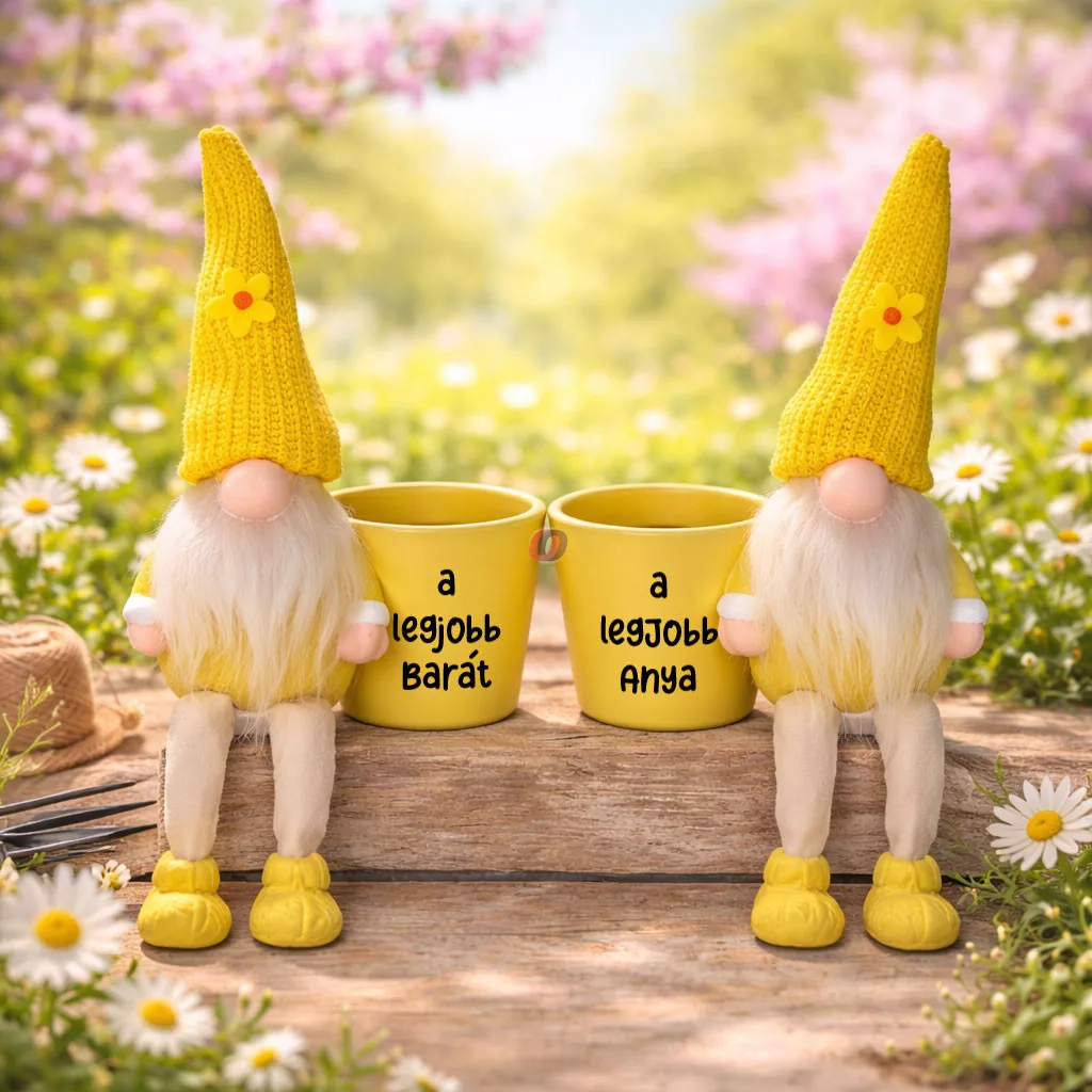 Személyre szabható manó kaspóval, sárga, egyedi felirattal 14 cm. Kiváló minőségű dekorációs kiegészítő tavaszi, húsvéti szezonban