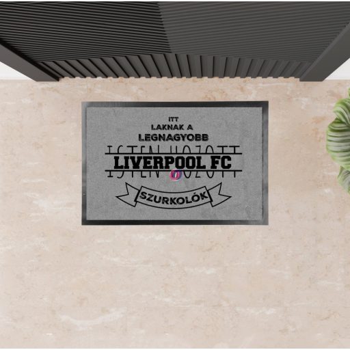 Szurkolói Lábtörlő egyedi szöveggel 60x40 cm szürke "Itt laknak a...". Ideális a bejárati ajtórnál, a kertben, vagy a bárhol a lakásban. Anyaga gumi, poliészter.