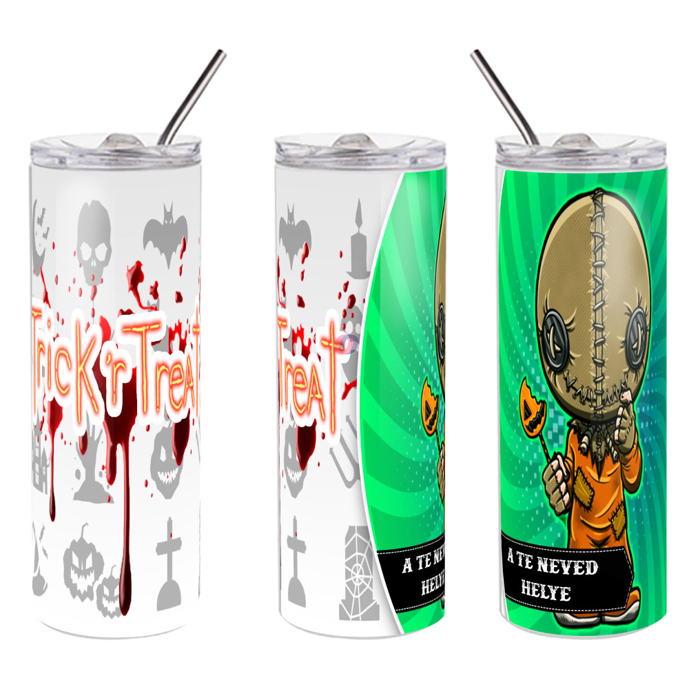 Ez a személyre szabható TRICK R TREAT TEMATIKÁJÚ duplafalú tumbler szuper kiegészítője lesz a Halloweennek, vagy bármilyen sporteseménynek, túrázásnak Prémium grafika és anyag. A kulacs teljes felületére felkerül a nyomat!