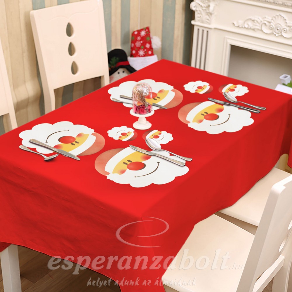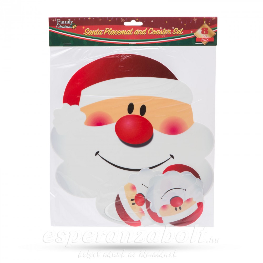 Karácsonyi asztali tányér- és poháralátét mikulás mintával. A szett 4 tányér és 4 mosolygós mikulásos poháralátétet tartalmaz.