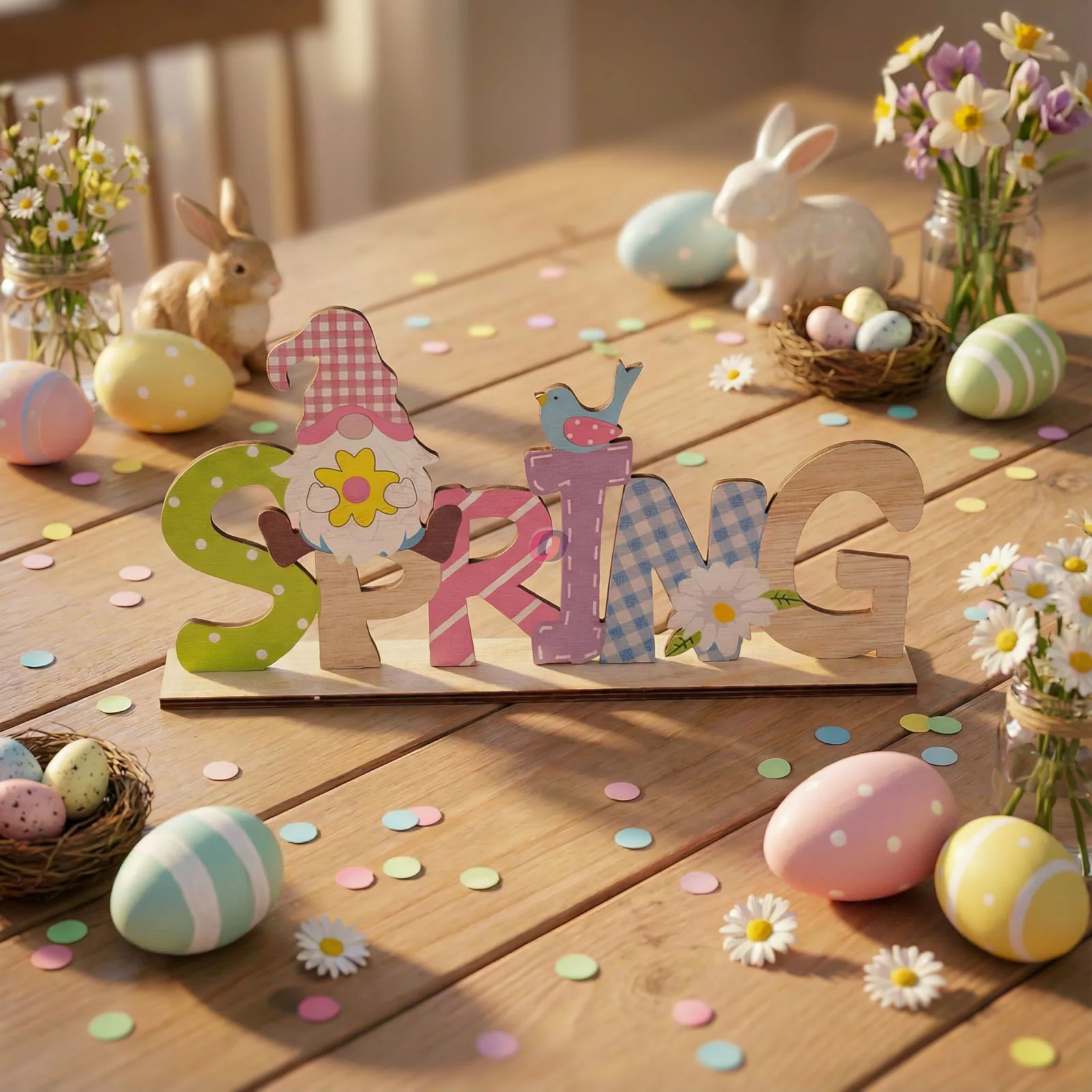Dobja fel ünnepi asztalát ezzel a vidám, manós húsvéti dekorációval! A fából készült fekvő asztaldísz színes betűkkel formázza az "SPRING" feliratot, amelyet aranyos manó, kismadár és tavaszi virágok díszítenek. A dekoráció könnyedén elhelyezhető asztalon, polcon vagy komódon, és azonnal ünnepi hangulatot teremt otthonában. Tartós fa anyagának köszönhetően hosszú ideig megőrzi szépségét, így évről évre újra felhasználható.