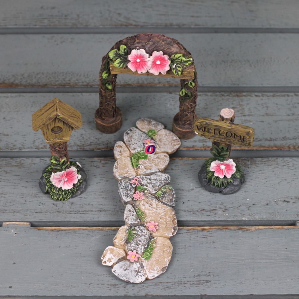 Ez a tündérkert bútor szett tökéletes kiegészítő minden tündérkerthez. A szettben egy jelzőtábla, egy postaláda, egy járda elem és egy boltív található