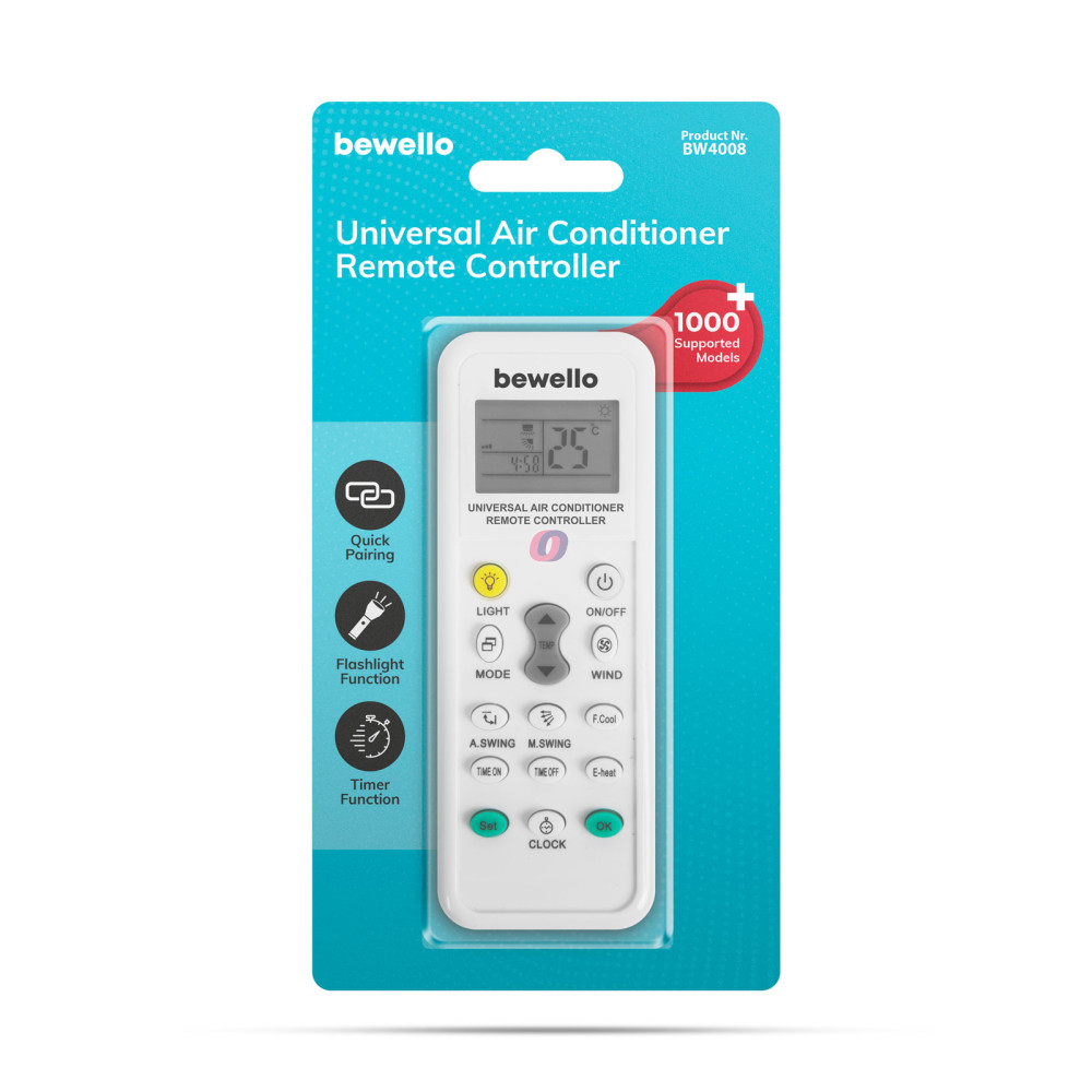 Univerzális klíma távirányító, amely szinte az összes klímagyártó berendezésével kompatibilis. Kiváló megoldás, ha az eredeti távirányító eltűnt, elveszett, megrongálódott vagy nem működik vagy ha több típusú klímát szeretne egy távirányítóval irányítani. Nem szükséges a gombokat egyesével feltanítani, elég ha beállítja a leírásnak megfelelő gyártói kódra a távirányítót és a funkciók máris használhatóak.