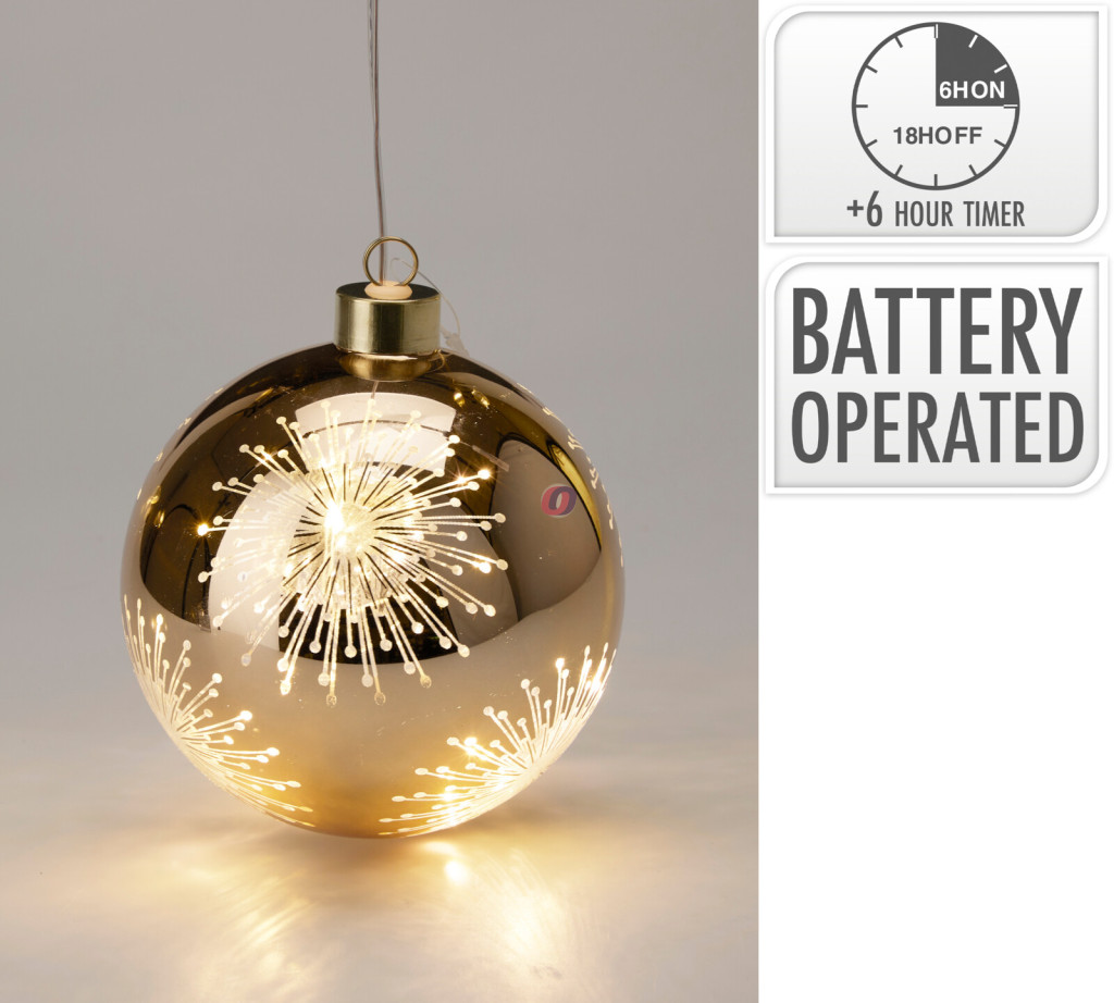 Üveg Karácsonyi Gömb – Csillag Mintával és LED Világítással – Arany, 12 cm