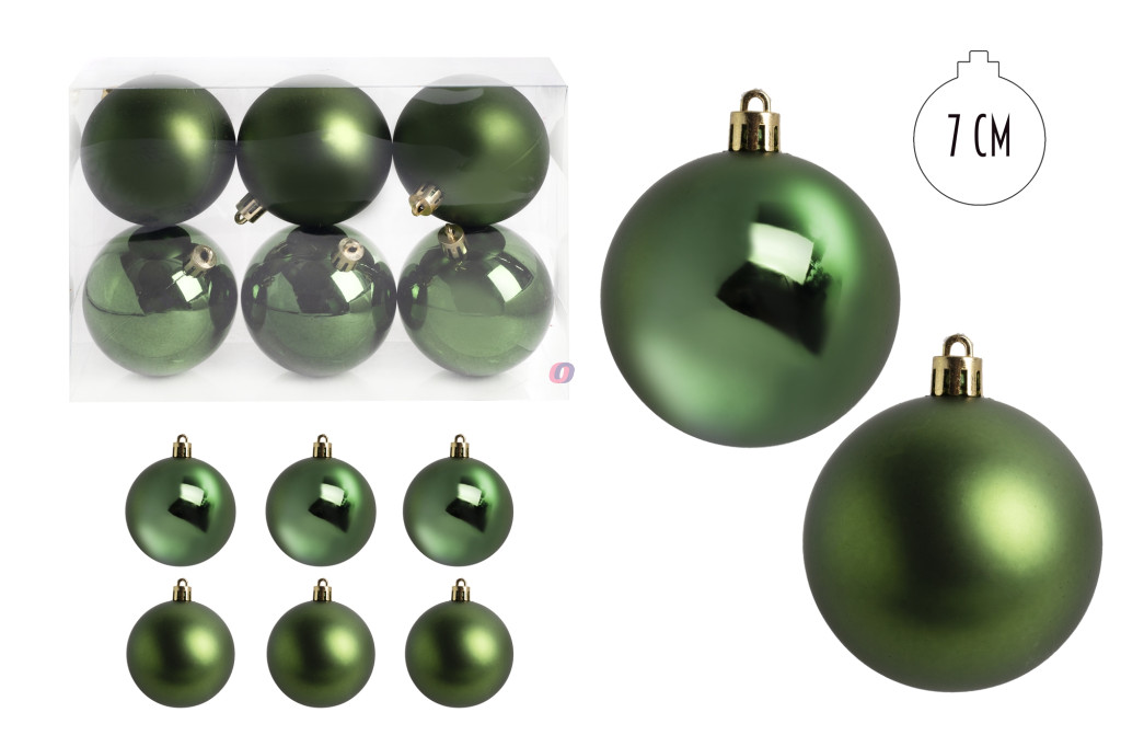 Dobd ünnepi pompába karácsonyfádat ezzel a 6 darabos karácsonyi gömb szettel! A 70 mm-es, zöld színű díszek kétféle különleges felületkialakítással érkeznek, így változatos és harmonikus összképet biztosítanak.