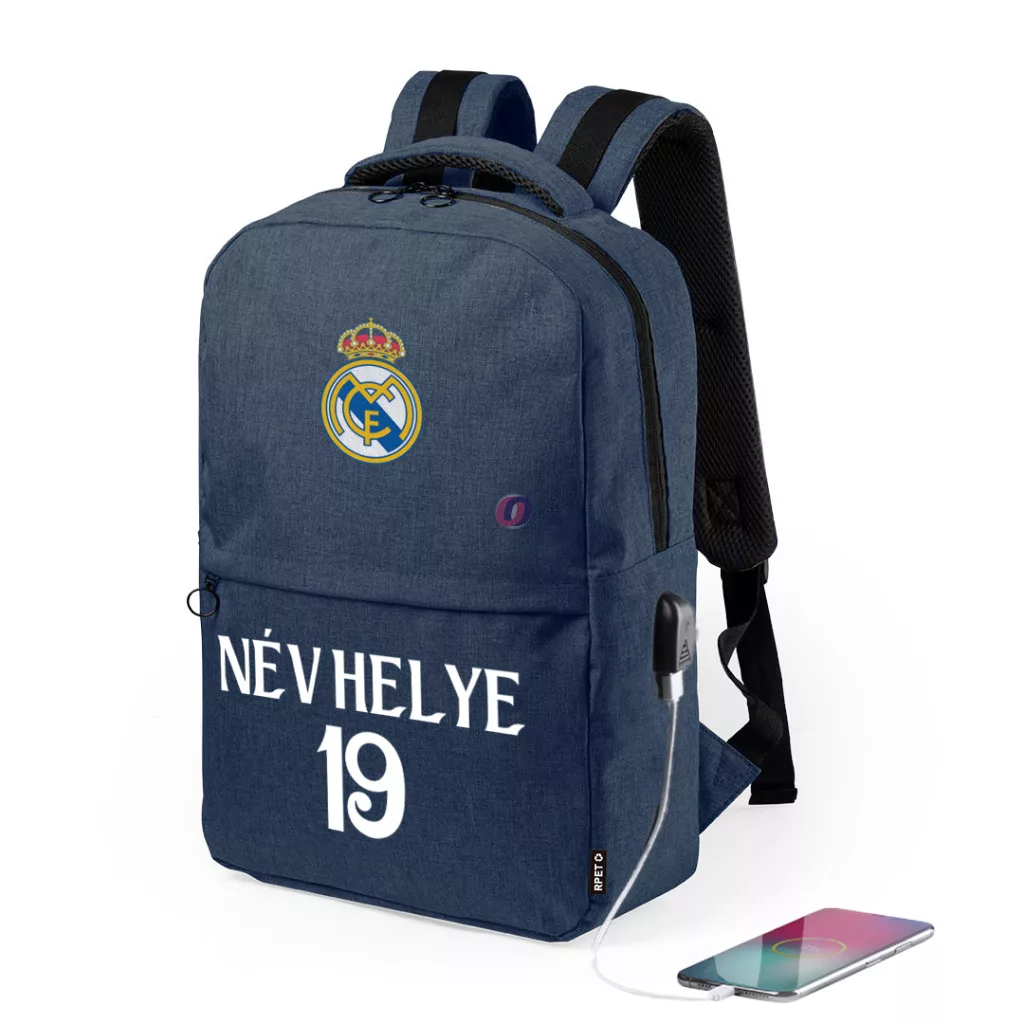 Real Madrid hátizsák USB-s, személyre szabható egyedi névvel és számmal Sötétkék, ami szuper kiegészítője lesz a mindennapoknak, túrázásoknak, sport tevékenységeidnek, de akár Suliba is viheted Méretének köszönhetően. Prémium grafika és anyag.