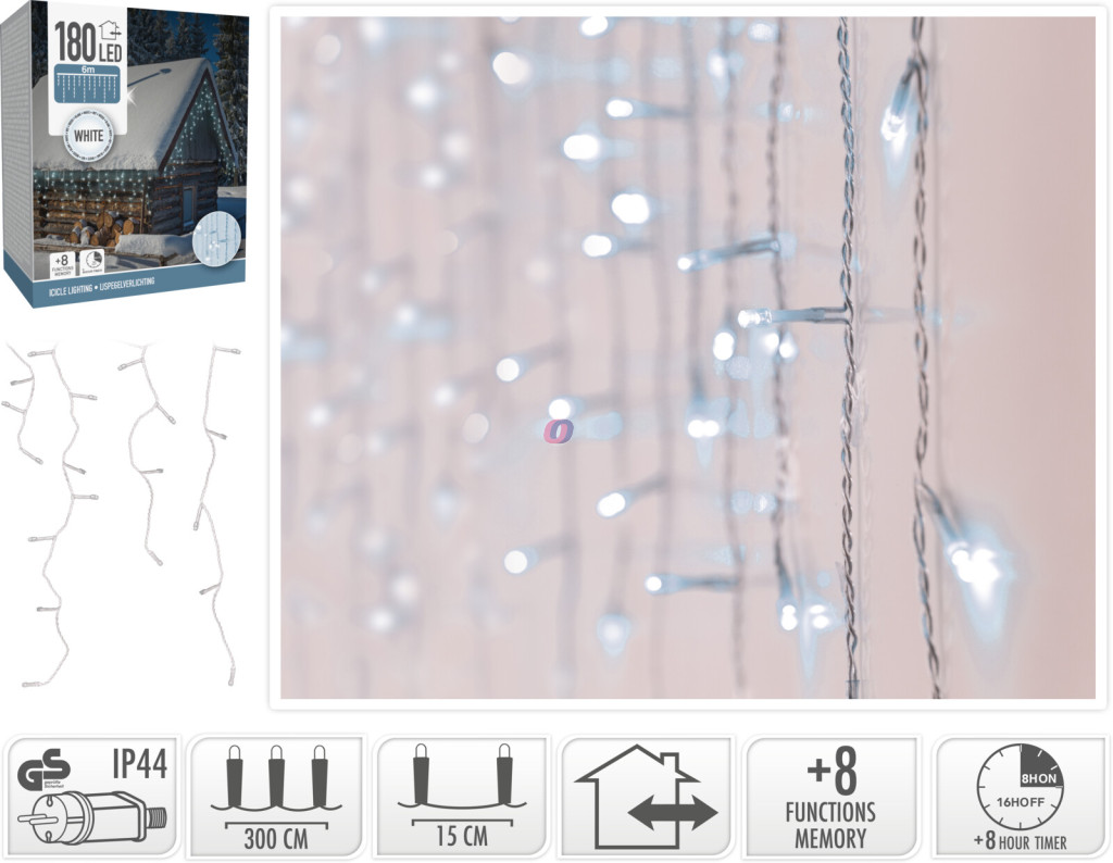 Dobd fel otthonod külsejét vagy belső terét ezzel a látványos LED jégcsap fényfüzérrel! A 600 x 52 cm-es füzéren 180 darab fehér LED világít, amelyek a jégcsapokat idéző formában lógnak alá, ezzel varázslatos téli hangulatot teremtve. Az időzítő funkciónak köszönhetően 8 órán át világít, majd automatikusan 16 órára kikapcsol.