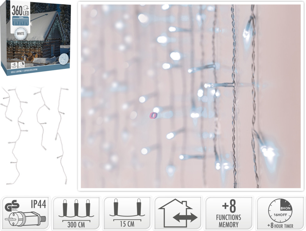 Dobd fel otthonod külsejét vagy belső terét ezzel a látványos LED jégcsap fényfüzérrel! A 1200 x 52 cm-es füzéren 360 darab fehér LED világít, amelyek a jégcsapokat idéző formában lógnak alá, ezzel varázslatos téli hangulatot teremtve. Az időzítő funkciónak köszönhetően 8 órán át világít, majd automatikusan 16 órára kikapcsol.