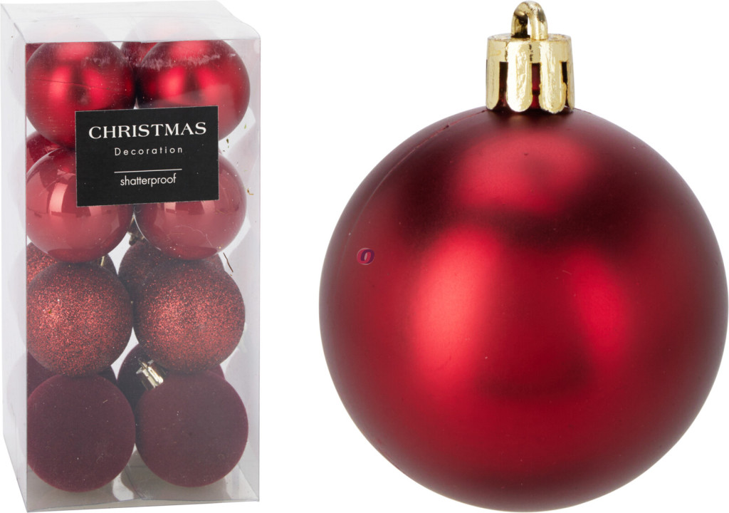 Ez a 16 darabos sötétpiros karácsonyfadísz szett a hagyományos karácsonyi hangulatot modern kivitelben hozza el otthonodba. A díszek 50 mm átmérőjűek, tartós PP anyagból készültek, így törésmentesek és hosszú élettartamúak.
