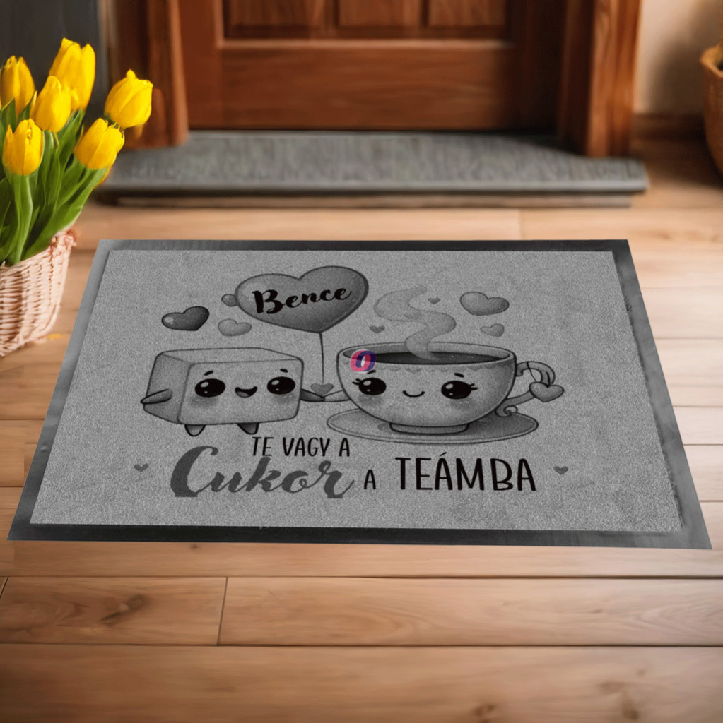 Egyedi neves Szerelmes Lábtörlő 60X40 cm "Te vagy a cukor a teámba"szürke, fekete.  Kiváló minőségű dekorációs kiegészítő, de szuper ajándék is lehet