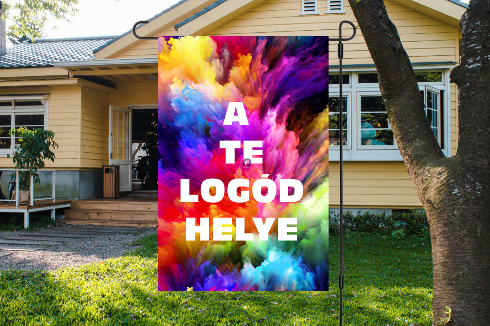 Stílusos, egyedi logóval, vagy képpel ellátott nagyméretű kerti zászló, mely kiváló kerti dekoráció lesz. Ideális otthon a bejárati ajtajtónál, vagy bárhol ahol szükség van rá. Anyaga fém, poliészter.